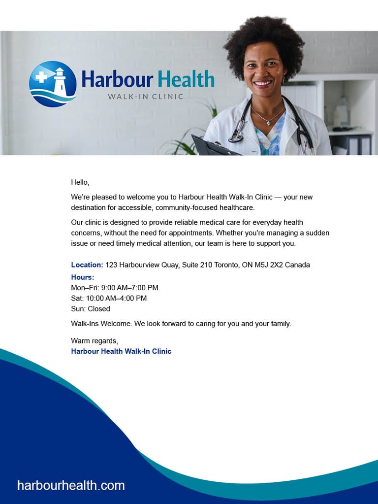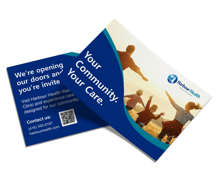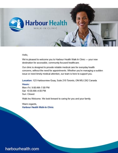 I designed a series of digital and print materials for a Harbourfront neighborhood clinic, promoting newly opened services and welcoming new patients within the community.